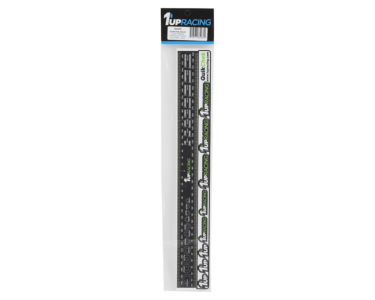 Apply the 1up Racing QuikChek decal to your pit board or desk for Quik reference of wheelbase, popular bearing and screw sizes, and a ruler!