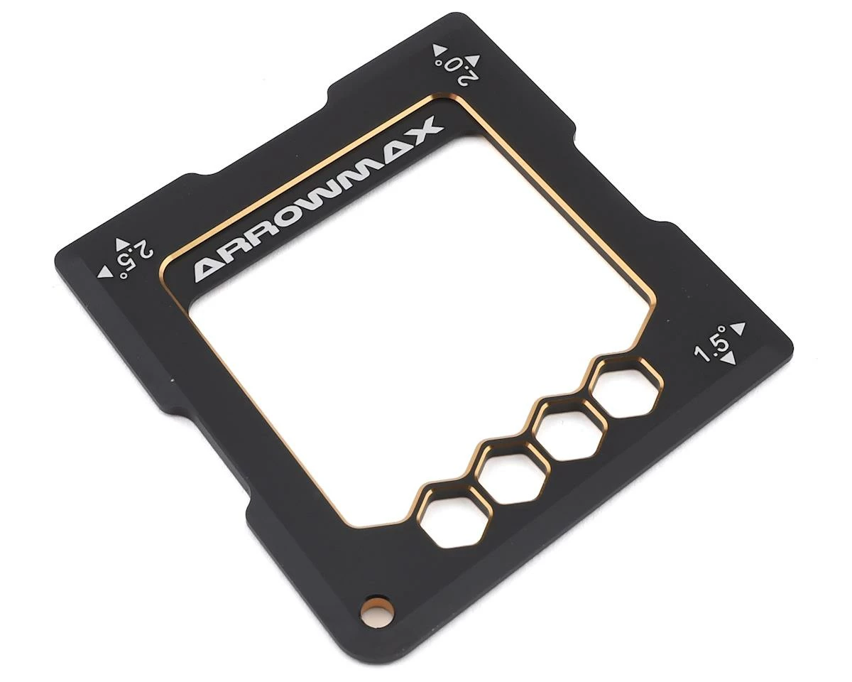 The Arrowmax 1/10 On Road Quick Camber Gauge is an easy to use camber gauge for 1/10th on road vehicles. Designed for quick and easy camber angle checks the 1-piece gauge allows to measure angles of 1.5, 2.0 and 2.5 degree by simply placing the gauge alongside the wheel. The tool is made from CNC-machined aluminium, with a Honeycomb-design and black and golden surface treatment. It has been laser-engraved for easy identification while milled-out sections make way for the wheel nuts.