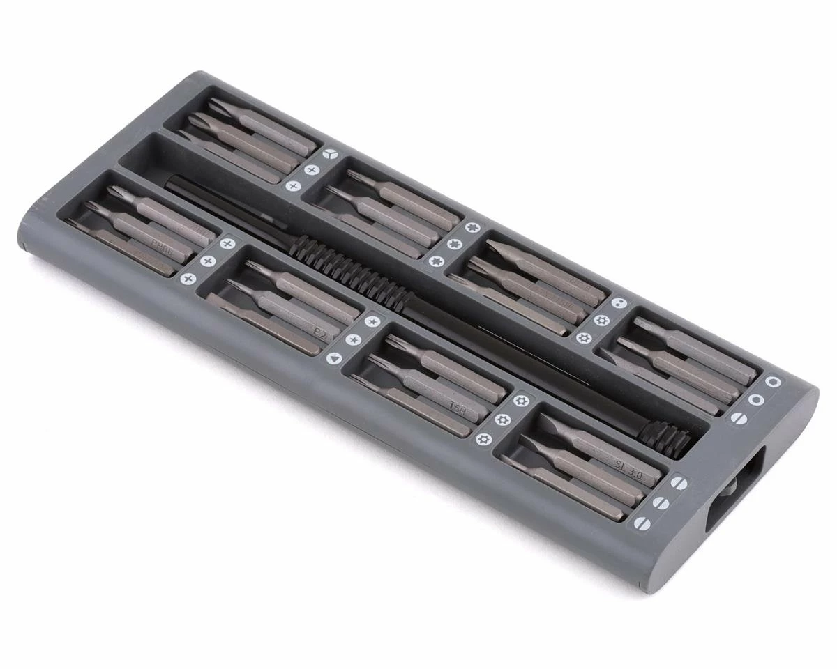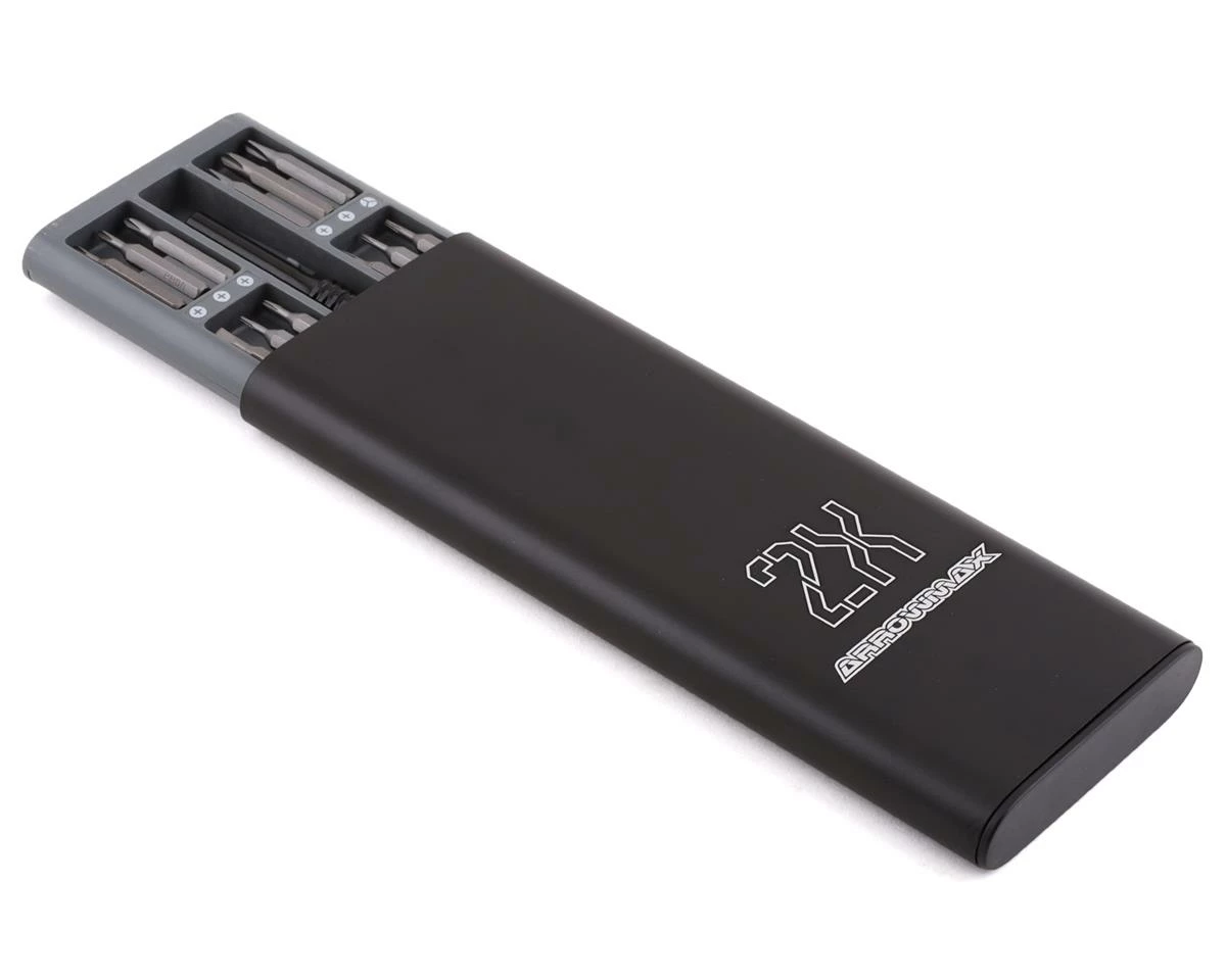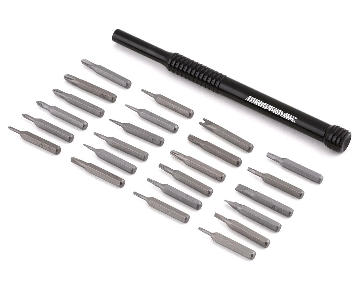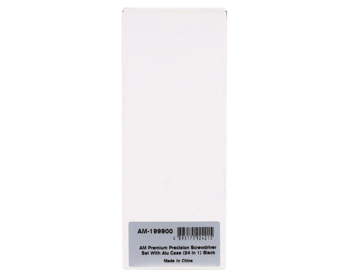 The AM Aeromax Premium Precision Screwdriver Set with Case includes 24 different tips. This screwdriver features a non-slip rectangular handle, 360 rotating cap, magnetized tips, plastic tray and aluminum case. Package includes one driver and twenty-four various bits.