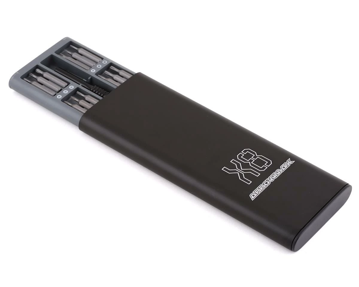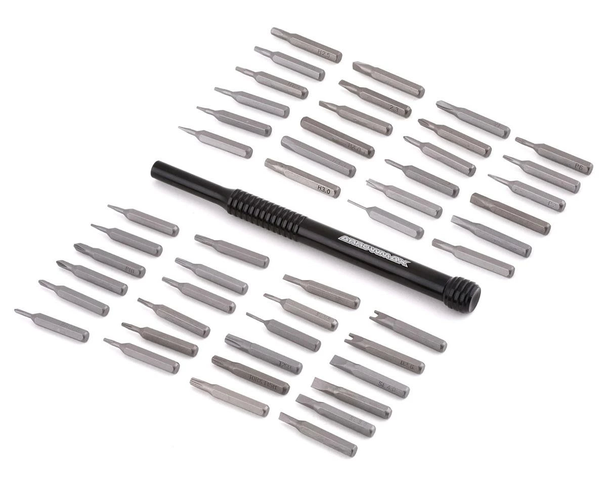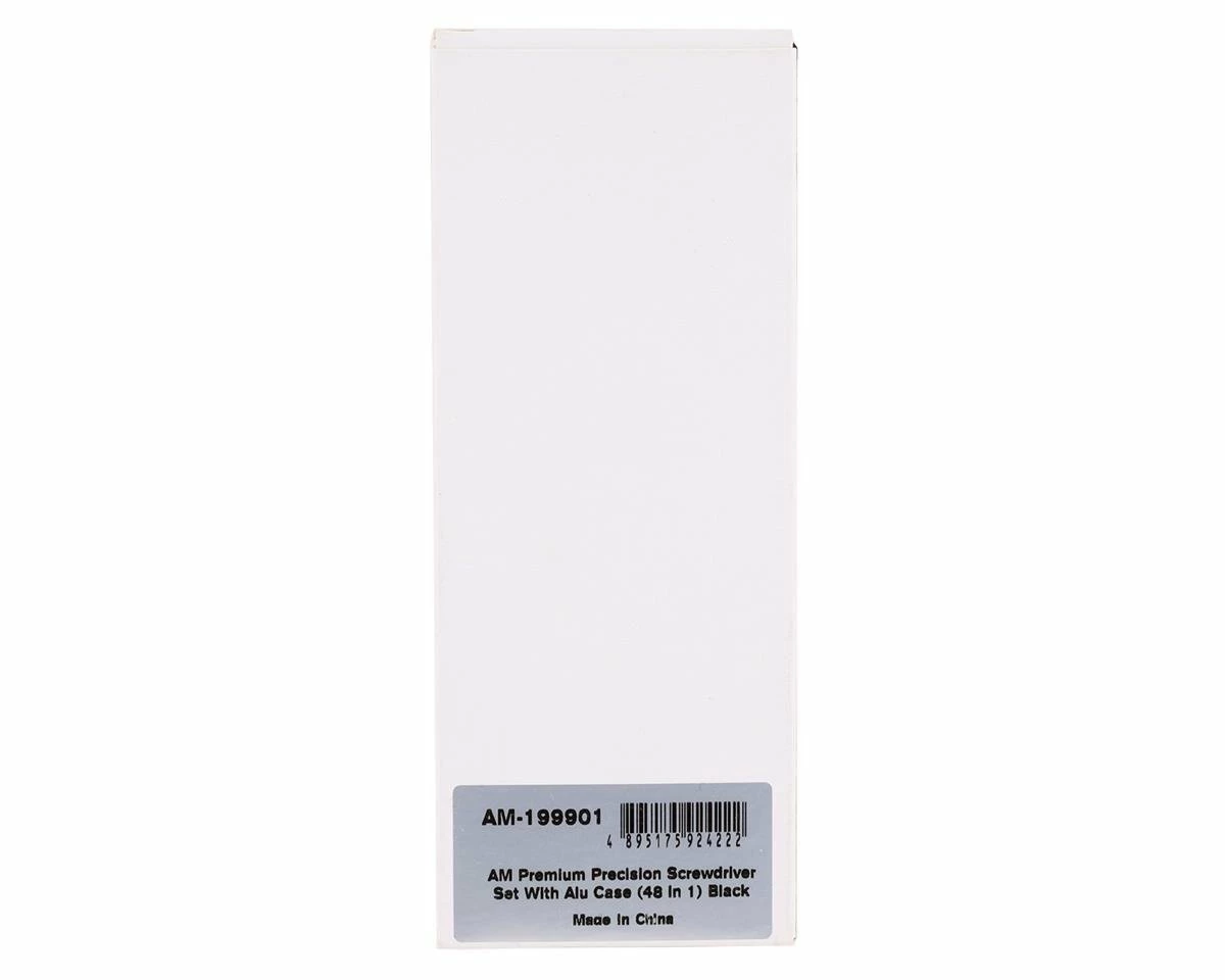 The AM Aeromax Premium Precision Screwdriver Set with Case includes 48 different tips. This screwdriver features a non-slip rectangular handle, 360 rotating cap, magnetized tips, plastic tray and aluminum case. Package includes one driver and forty-eight various bits.