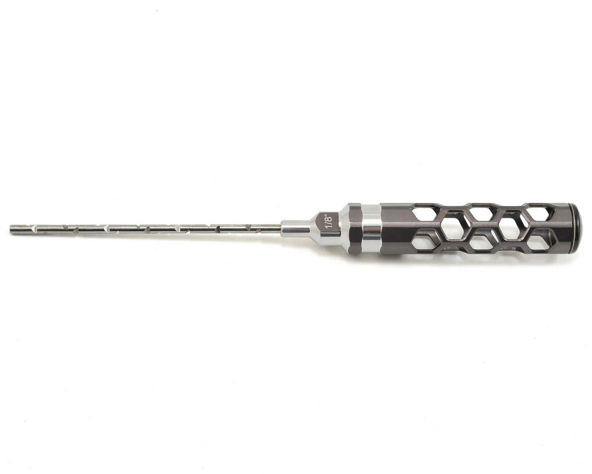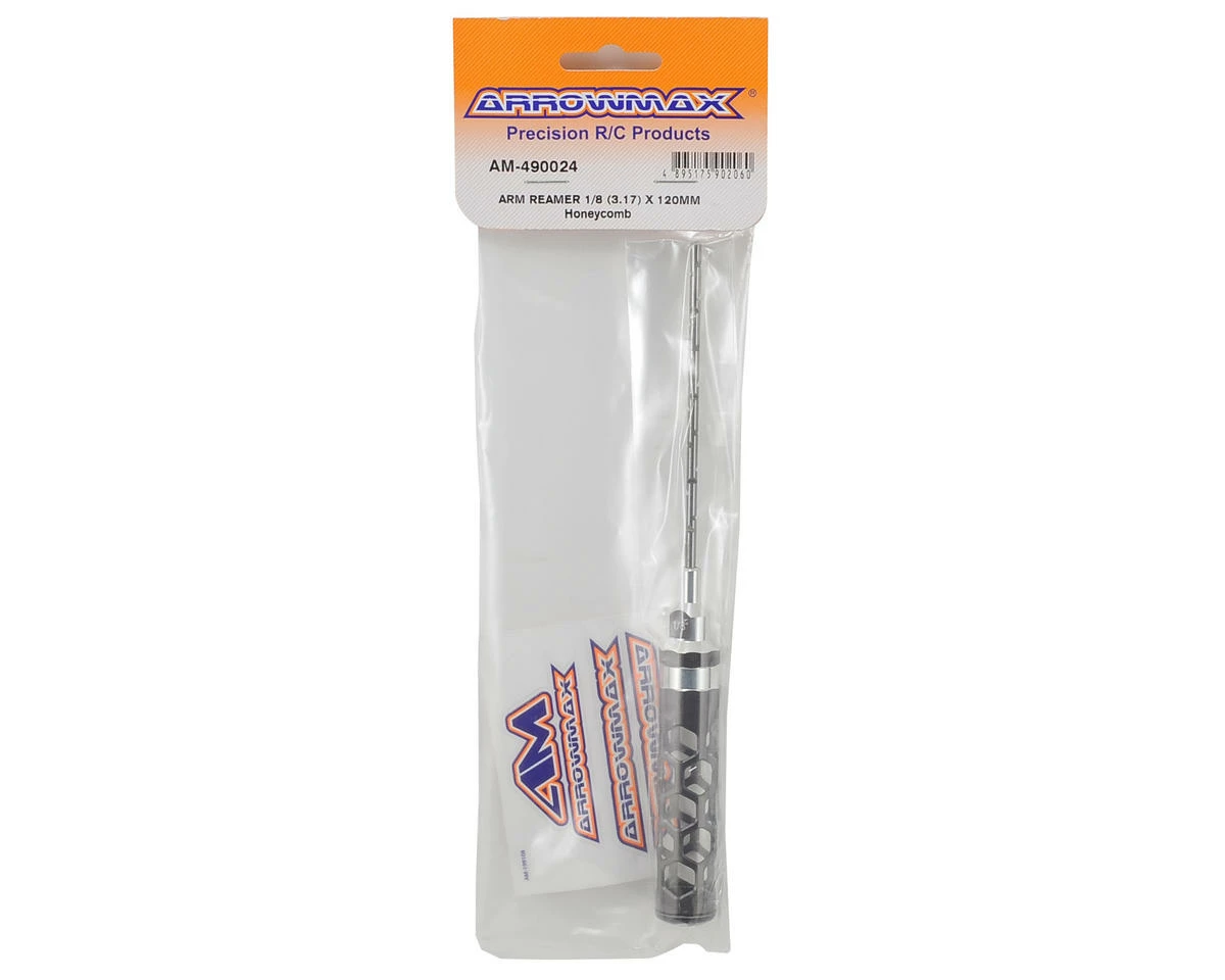 This is an Arrowmax Honeycomb 1/8″ Arm Reamer. Arrowmax tools feature an eye-catching, light weight, hollow honeycomb handle design. This tool is perfect for precisely resizing plastic holes without creating excessive slop, allowing you to build perfect free-moving suspension components. When combined with the lexan cap, you get a comfortable, controllable and lighter feeling tool that makes wrenching easier.