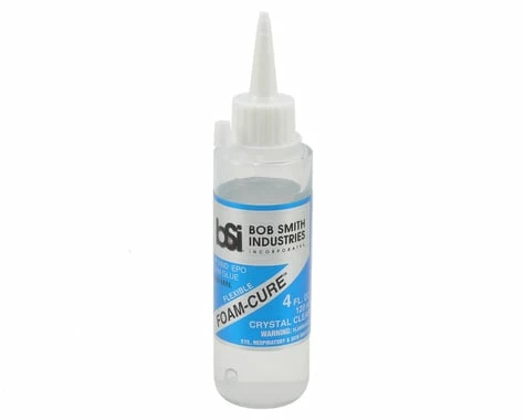 This is a four ounce bottle of Bob Smith Industries Foam-Cure Foam Safe Glue. This crystal clear glue is EPP and EPO foam safe and sets with a flexible bond. Regular CA glue cures stiff, but the flexibility of the Foam-Cure glue allows for better shock absorption and bond consistency.