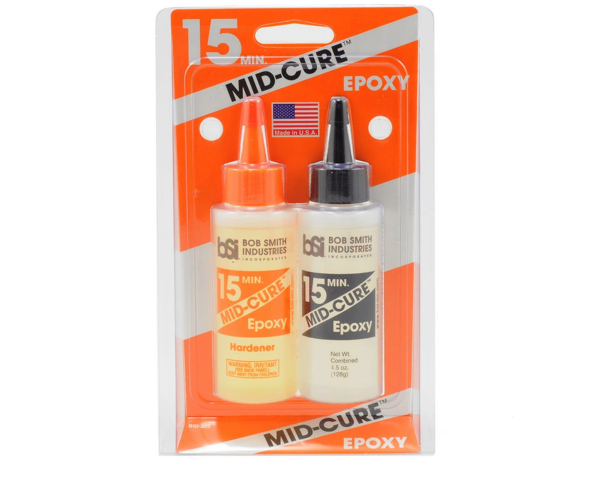 This is a four and a half ounce package of Bob Smith Industries MID-CURE™ 15 Minute Epoxy. MID-CURE™ 15 Minute epoxy is used in larger areas where more working time is needed. It is more water resistant and can be used as a substitute for QUIK-CURE™ in most applications. MID-CURE™ is BSI’s most flexible epoxy and is ideal for gluing to fiberglass surfaces. Allow 45 minutes before handling parts and 2 hours for full strength.