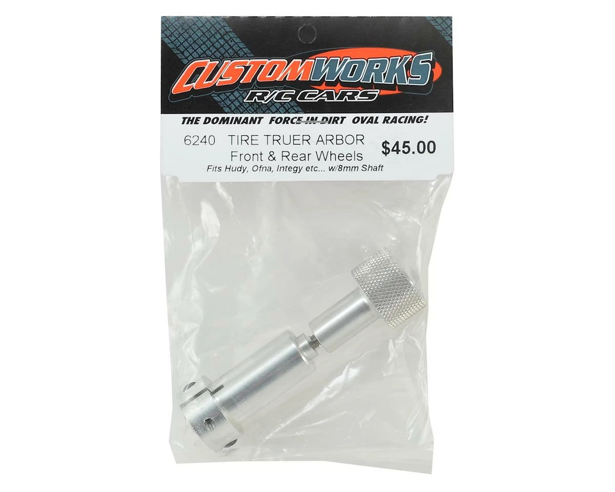 The Custom Works Tire Truer Arbor is used to true foam tires mounted on Custom Works, BSR, RC4Less and any other wheels using a 3/16″ axle and cross pin for the rear and 3/8″ bearings on the front. This design indexes on the back of the wheel in both cases and guarantees a true and perfect fit on all standard truers like Hudy, Integy, Ofna etc.