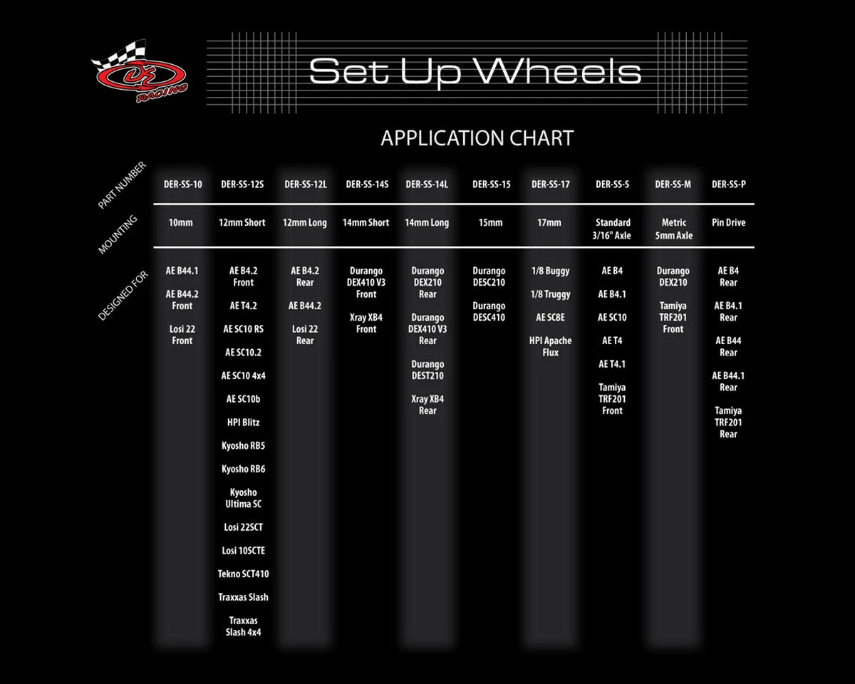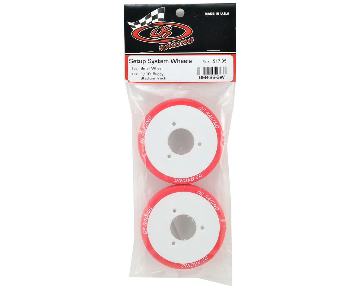 This is a pack of two DE Racing “Small” Setup Wheels, for 1/10 buggys and trucks that use 2.2 size wheels. The DE Racing setup system consists of setup wheels and a variety of interchangeable adapter hubs (not included) that allow the wheels to fit multiple vehicle types. The setup wheels are available in both a large diameter for 1/8 scale and short course, or a small diameter for models that use 2.2 size wheels. The wheels feature a smooth flat vertical surface for interface with your existing measurement tools, while the two different setup wheel sizes are used to set the ride height for your specific model. Though some of these “basic” features are unique unto themselves, the final feature is what creates the benchmark in chassis setup; DE Racing calls this “roll to set”.