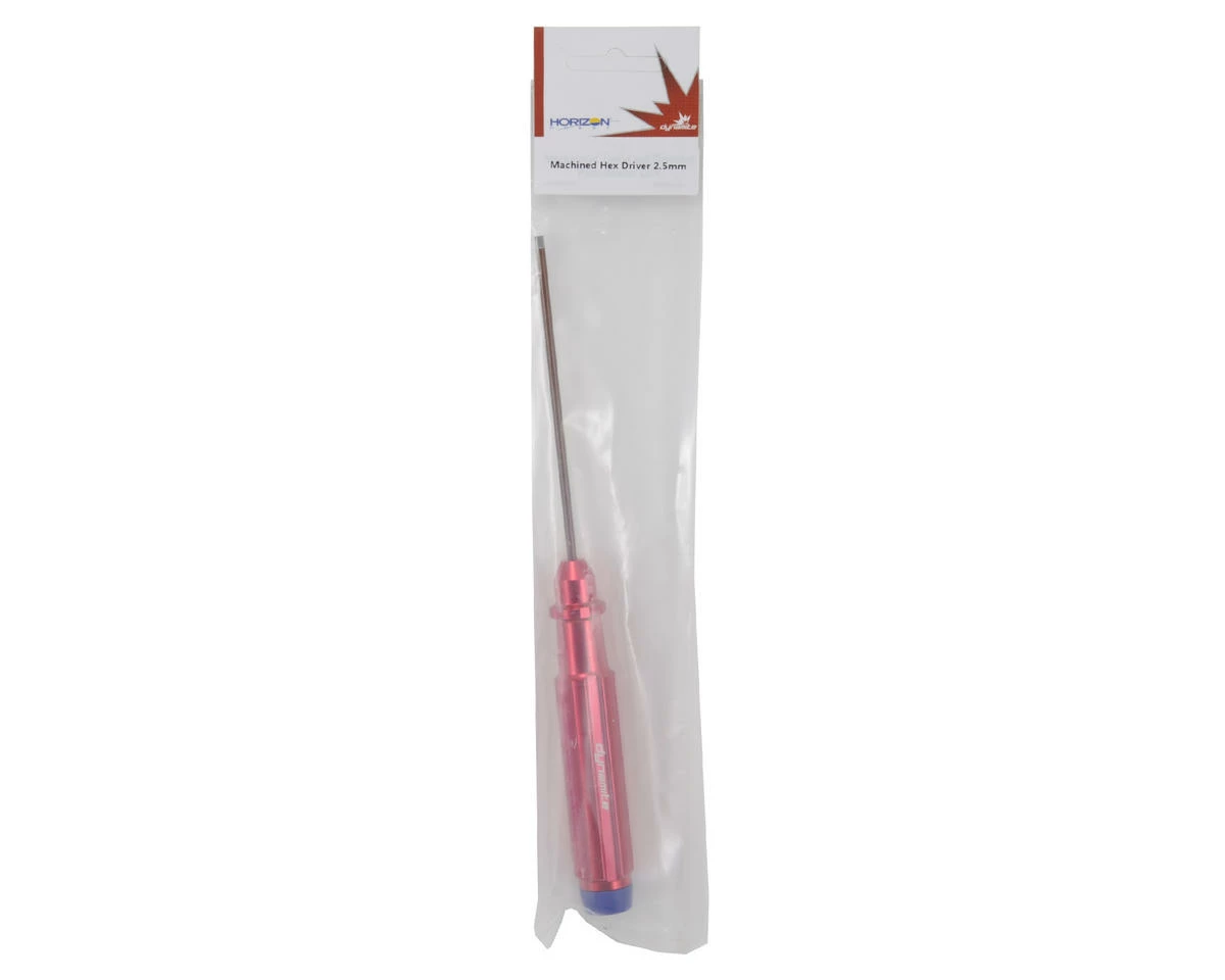 This is a Dynamite 2.5mm Machined Metric Hex Driver. Dynamite tools feature stylish red anodized aluminum handles, with replaceable steel tips. To make wrenching easier on your hands, the handles include rotating plastic end caps to swivel in your palm. Plus, the end caps have the tool size printed on the end, and are color coded for easy identification. Package includes 2.5mm size hex wrench.