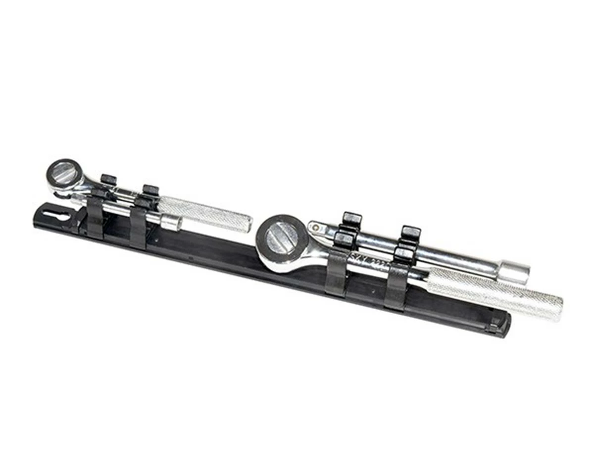 The Ernst Manufacturing 1/4” Face Mount Ratchet an Extension Holder is designed to securely hold 1/4″ drive ratchets and extensions in the toolbox or on the go. These holders snap onto the front side (face) of the socket organizer and can adjust to fit any length of ratchet or extension. Your ratchet and extensions are held in place alongside your sockets, right where they should always be.