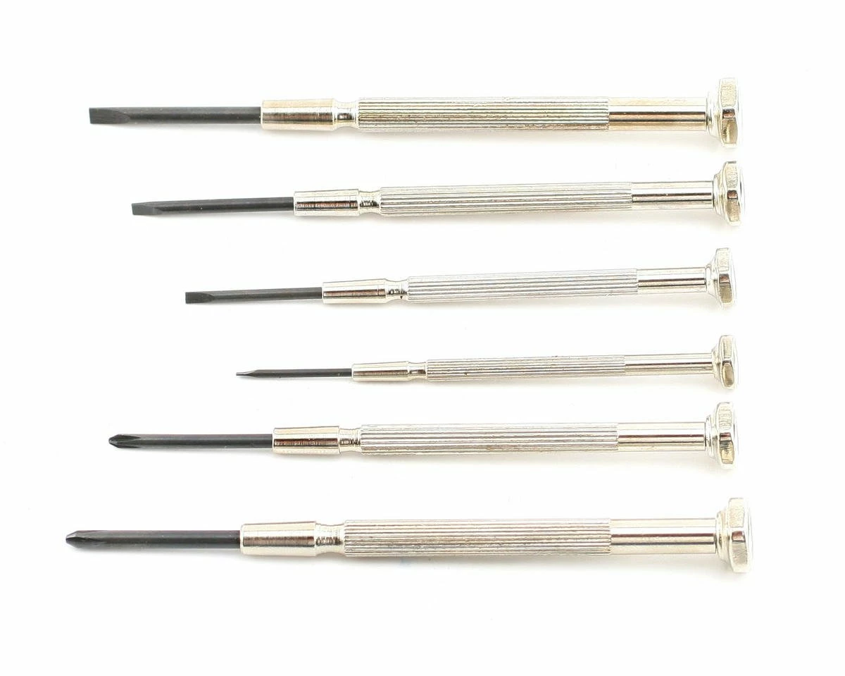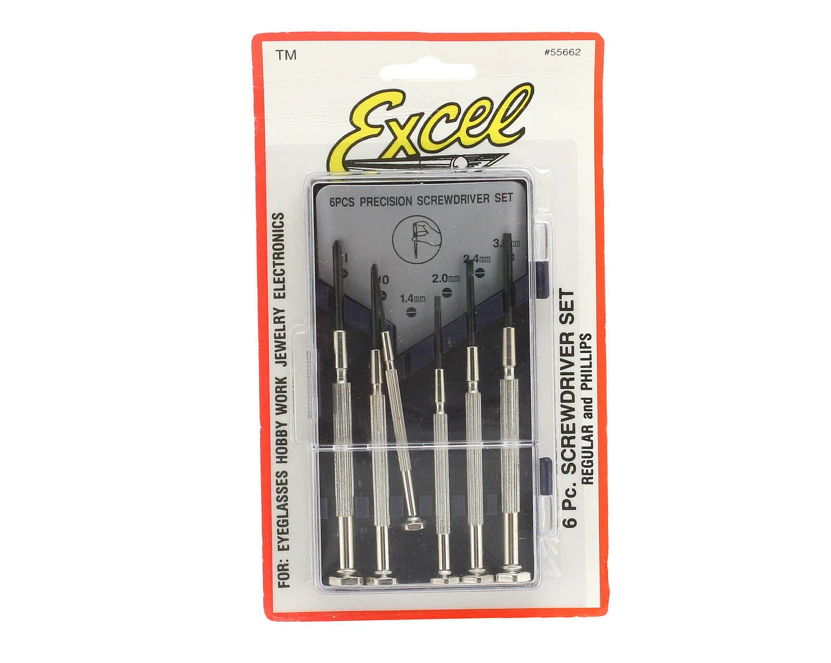 This is the Excel 6-Piece Jeweler Screwdriver Set. This set contains 4 flat screwdrivers (sizes 1.4mm, 2.0mm, 2.4mm and 2.9mm) and 2 phillips (#0 and #1.2) with chrome plated swivelheaded handles. It comes in a convenient plastic case. The blades are made of rustproof hardened alloy steel.