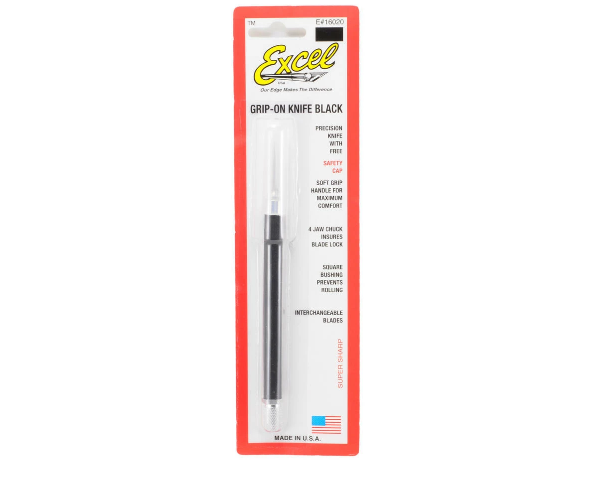 This is a black Grip-On hobby knife from Excel. This knife measures 5″ x 3/8″ Features include Comfortable Soft Grip handle, 4 jaw machined aluminum chuck for secure blade position, super sharp #11 Blade, convenient rear blade release and clear plastic safety cap for your protection. Used for cutting or trimming plastic, wood, paper, cloth and film. Available in six attractive colors.