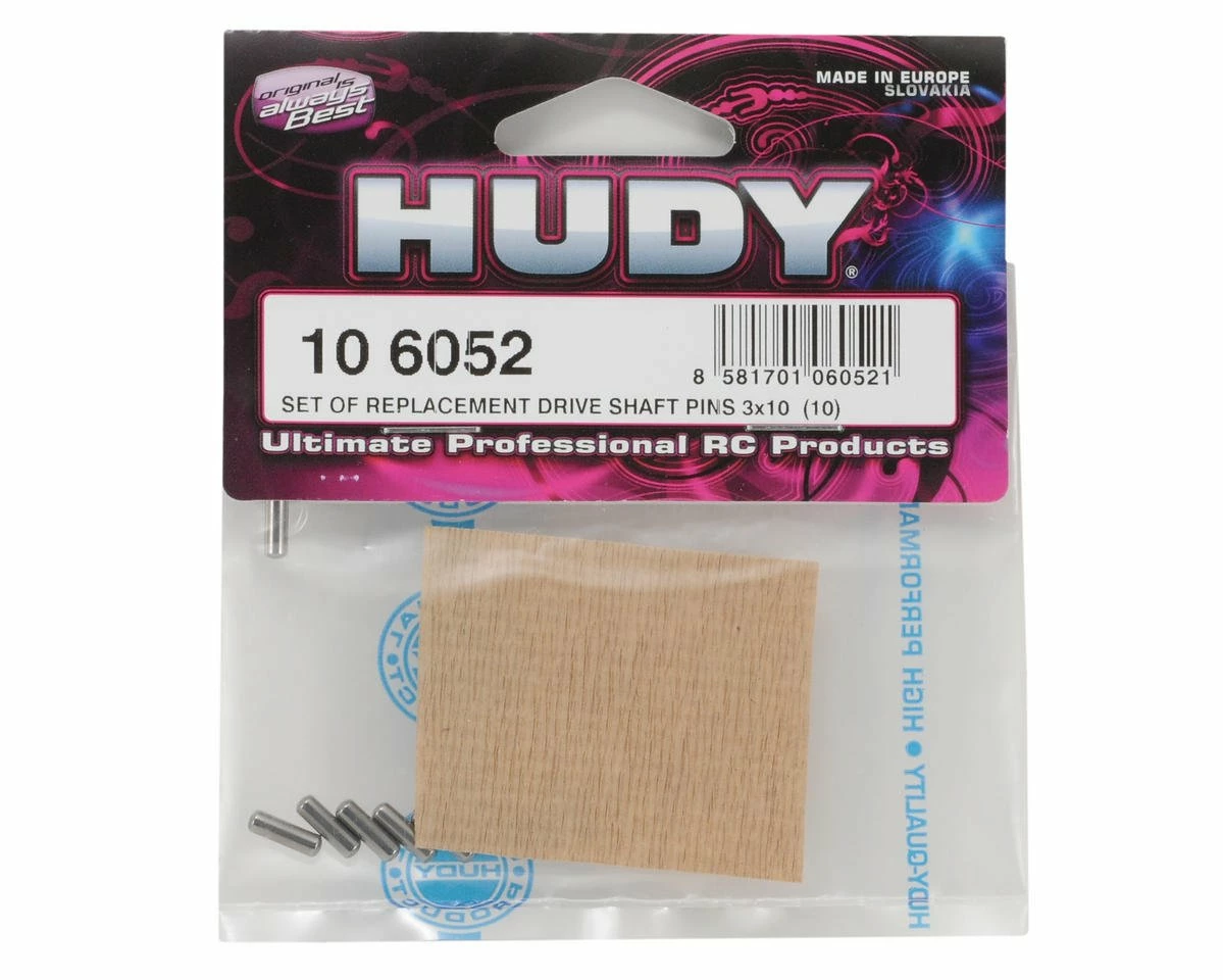 This is a set of ten replacement HUDY 3x10mm driveshaft pins. Extend the life of your driveshafts and outdrives, by replacing the pins with these hardened steel driveshaft pins at the first sign of wear. By using the HUDY #106000 3mm Drive Pin Replacement Tool, and the appropriate length pin, you can dramatically extend the working life of your drivetrain parts.