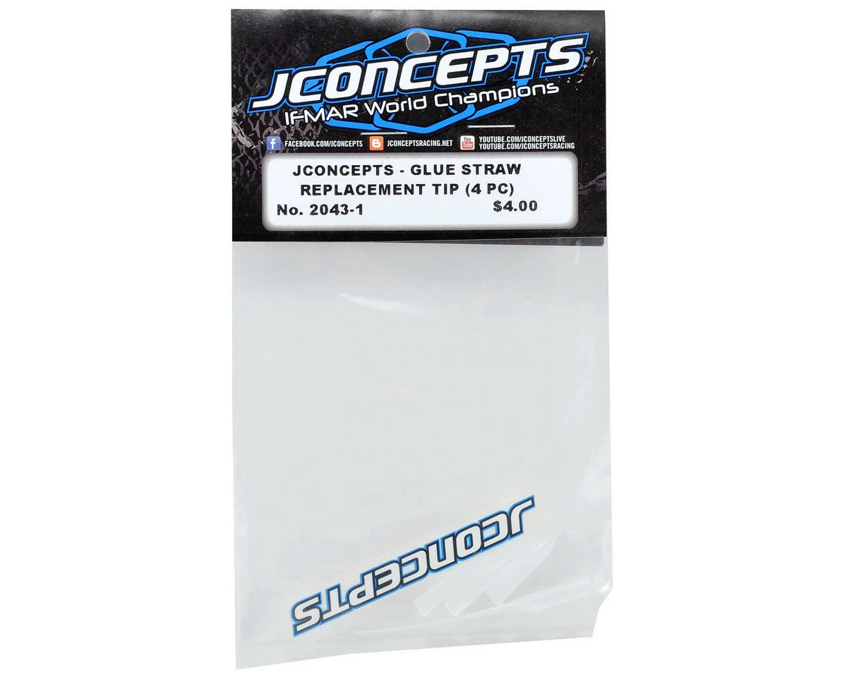 This is a pack of four JConcepts Glue Straw Tips. An accessory drivers never seem to have enough of in the pits are extra glue straws for the popular .7oz size glue bottle. Typically 1 straw will last several weekends or more, however, under certain conditions, they seem to get lost in the shuffle or cleaned incorrectly leaving the racer without this critical accessory at the worst possible time. Stock-up on glue tips so you never get caught in a pinch during a long race outing.