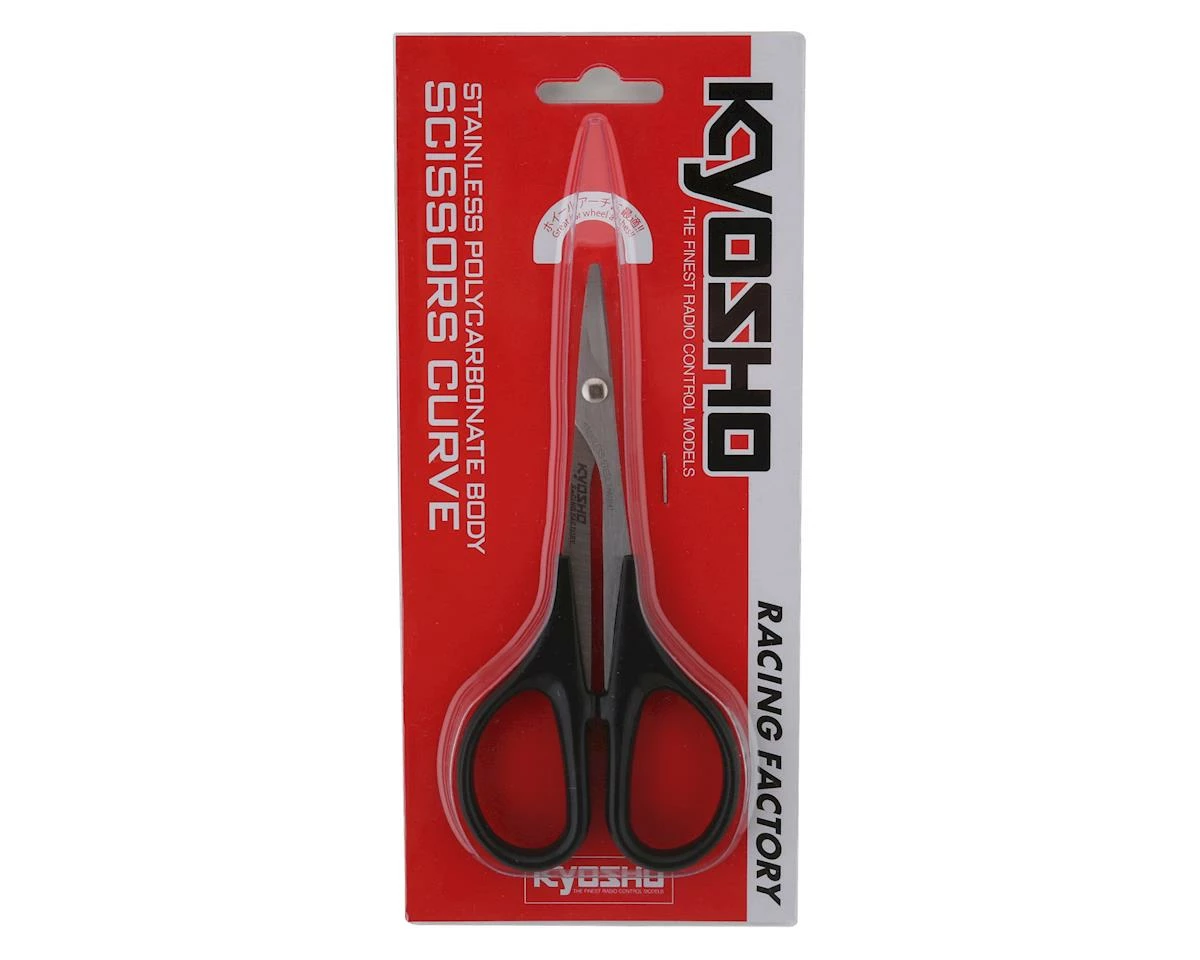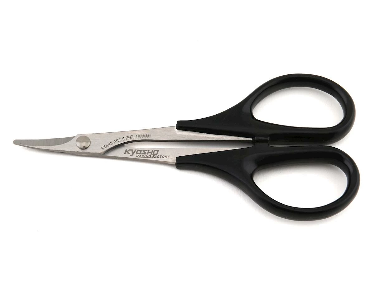 This is a pair of Kyosho KRF Scissors Stainless Curve Lexan Body Scissors, quality curved scissors for trimming and modifying your polycarbonate lexan bodies, wings and accessories.