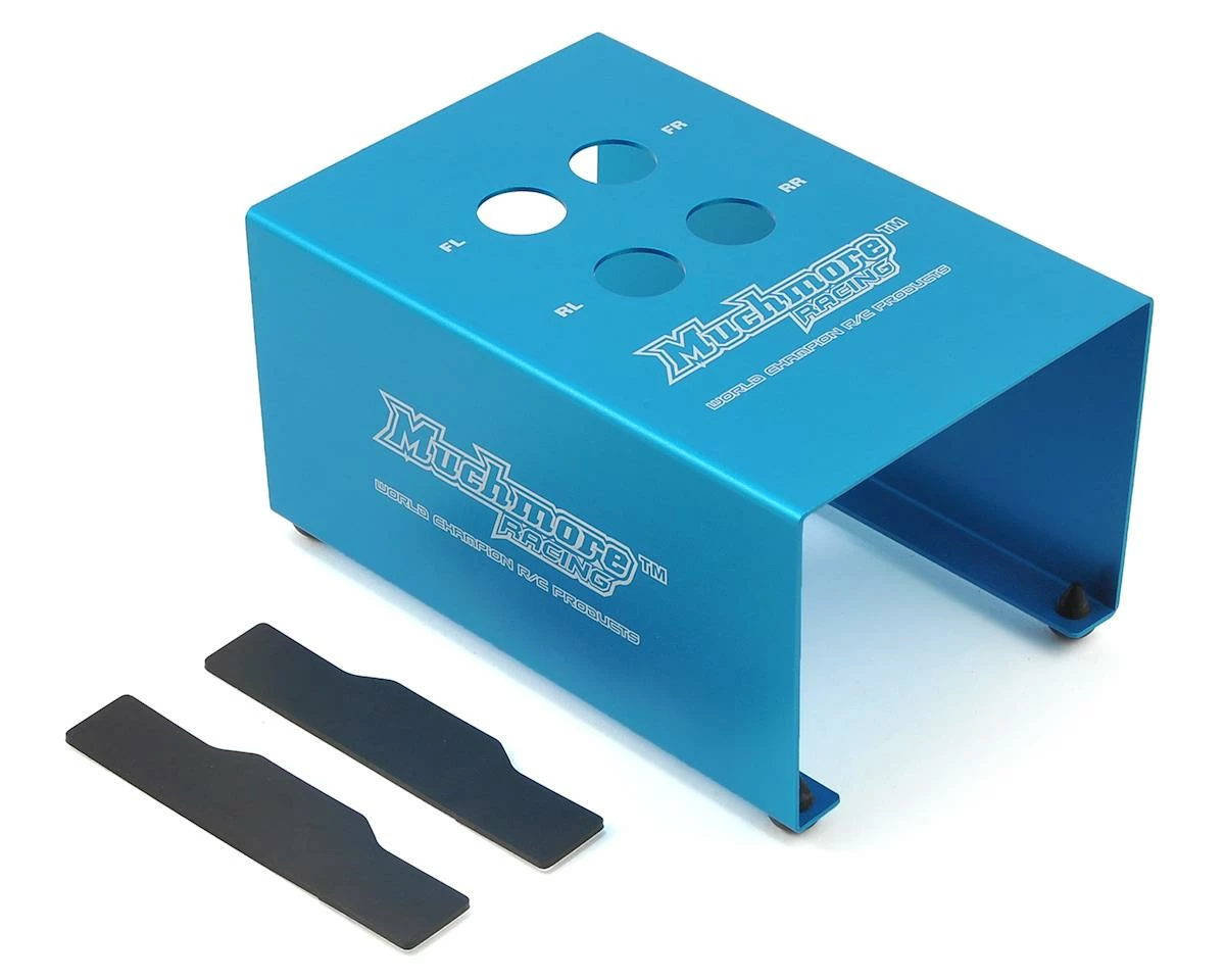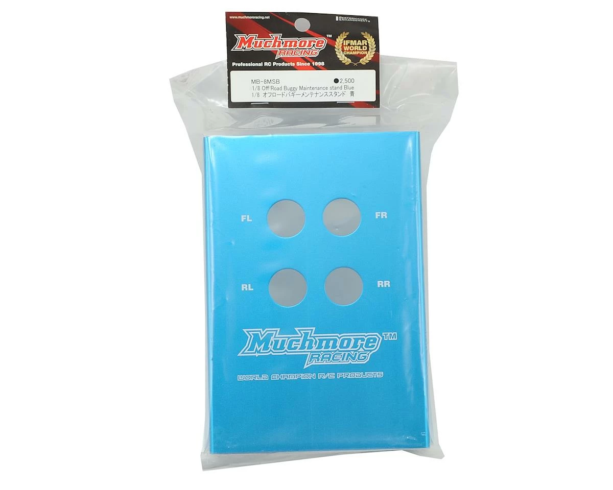 The Muchmore Racing 1/8 Off Road Buggy Maintenance Stand measures 160x108x85mm and features four 19mm holes in the top that can be used to hold your shock bodies during maintenance. Two adhesive foam pads are included that you attach to the stand to help prevent your car from sliding around on the stand.