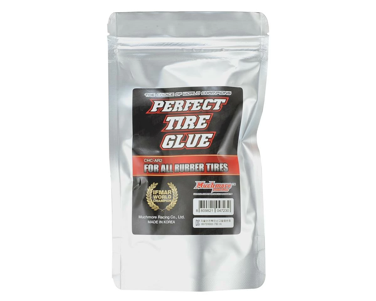 Muchmore Racing Perfect Tire Glue is recommended for all rubber tires. The bottle features a double locking cap, and the UV protected bag helps to keep the glue fresh. Plus, two stainless applicator nozzles are included, with a length of shrink tube that is used to hold the nozzle in place.