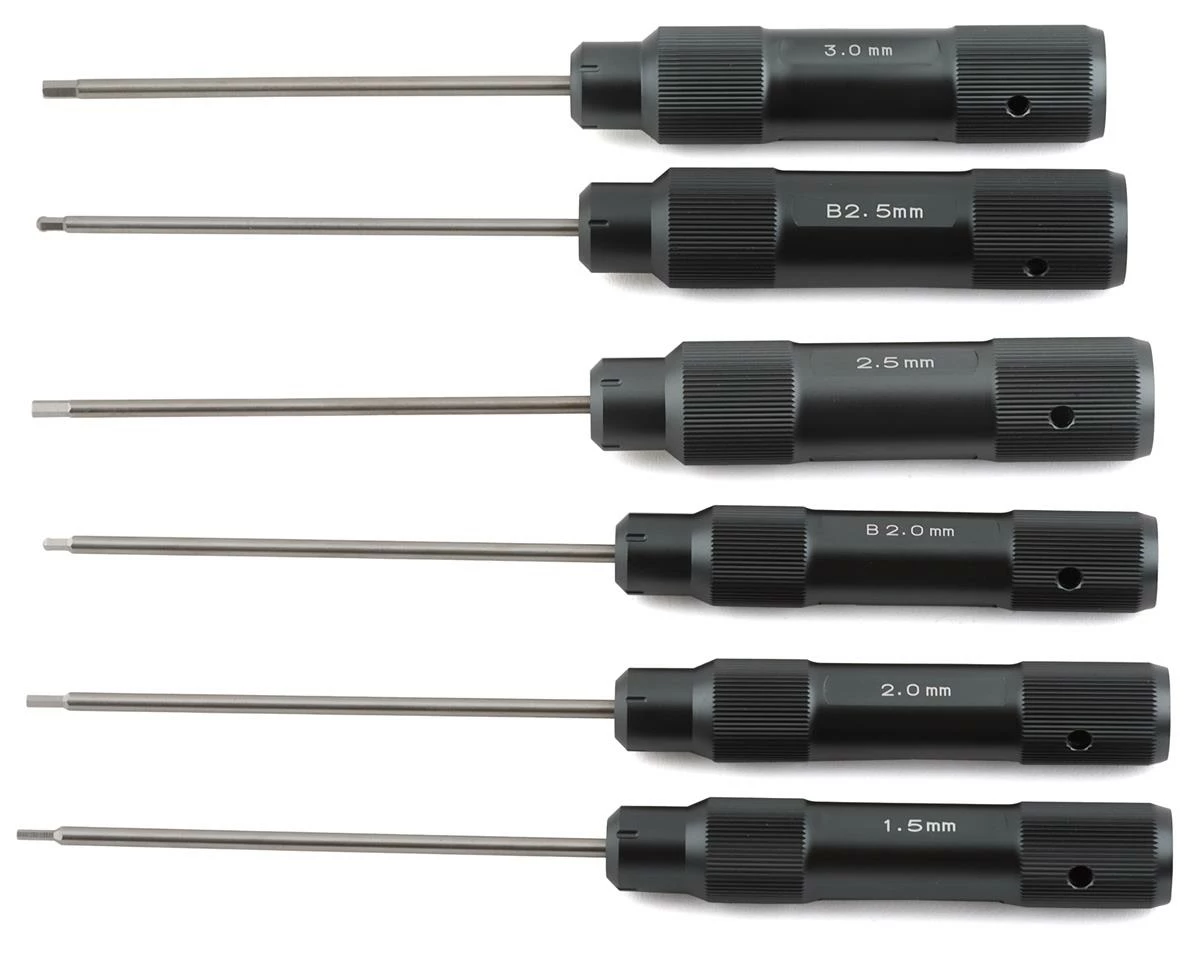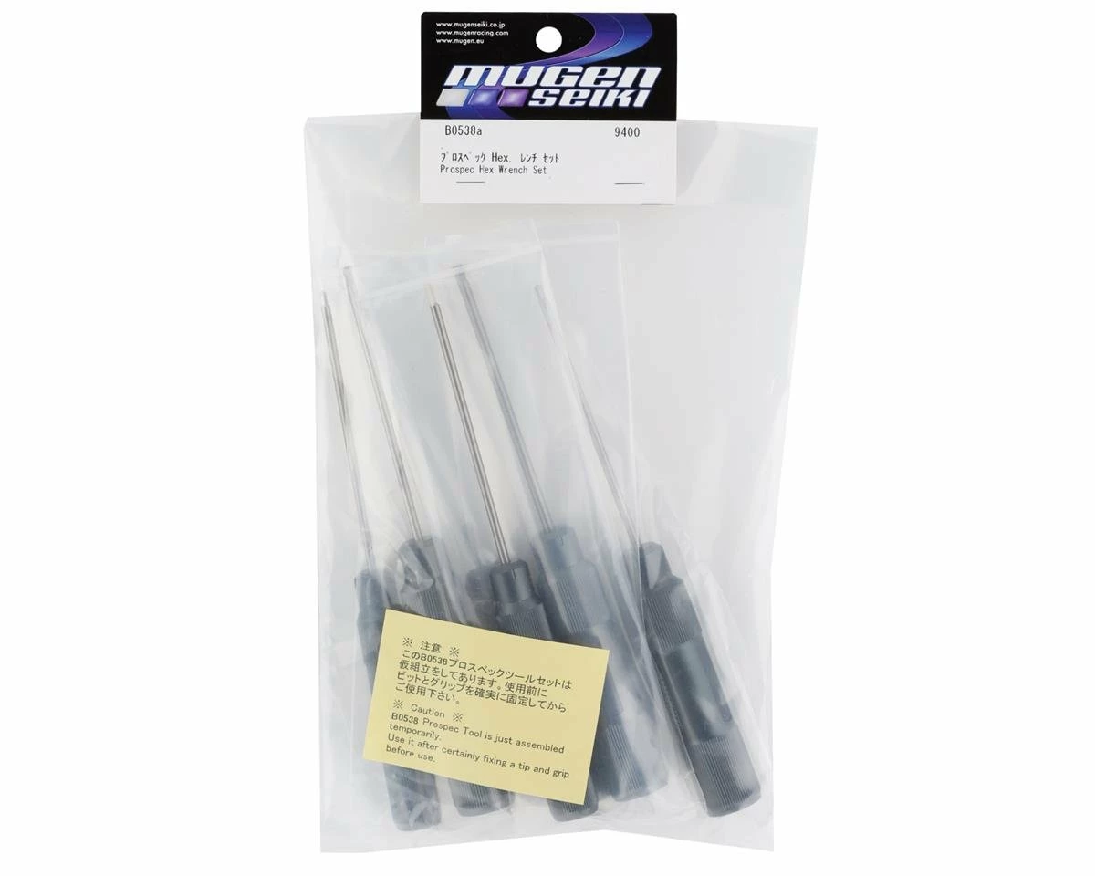 This is the Mugen ProSpec Allen Wrench Set. Featuring high quality CNC Machined, knurled handles and replaceable hardened steel tips. The handles on these tools are hollow to reduce weight and lessen fatigue, but also to allow the tips to be stored inside the handle to save space in your pit box.