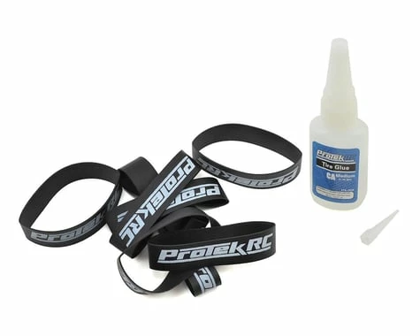 This is the ProTek R/C Tire Glue Combo, including one 0.75oz (21.2g) bottle of Medium CA Tire Glue, one glue tip and an eight pack of Tire Glue Bands. This combo is ideal for those needing to glue rubber tires to plastic wheels in the 1/10 and 1/8 scale off-road categories.