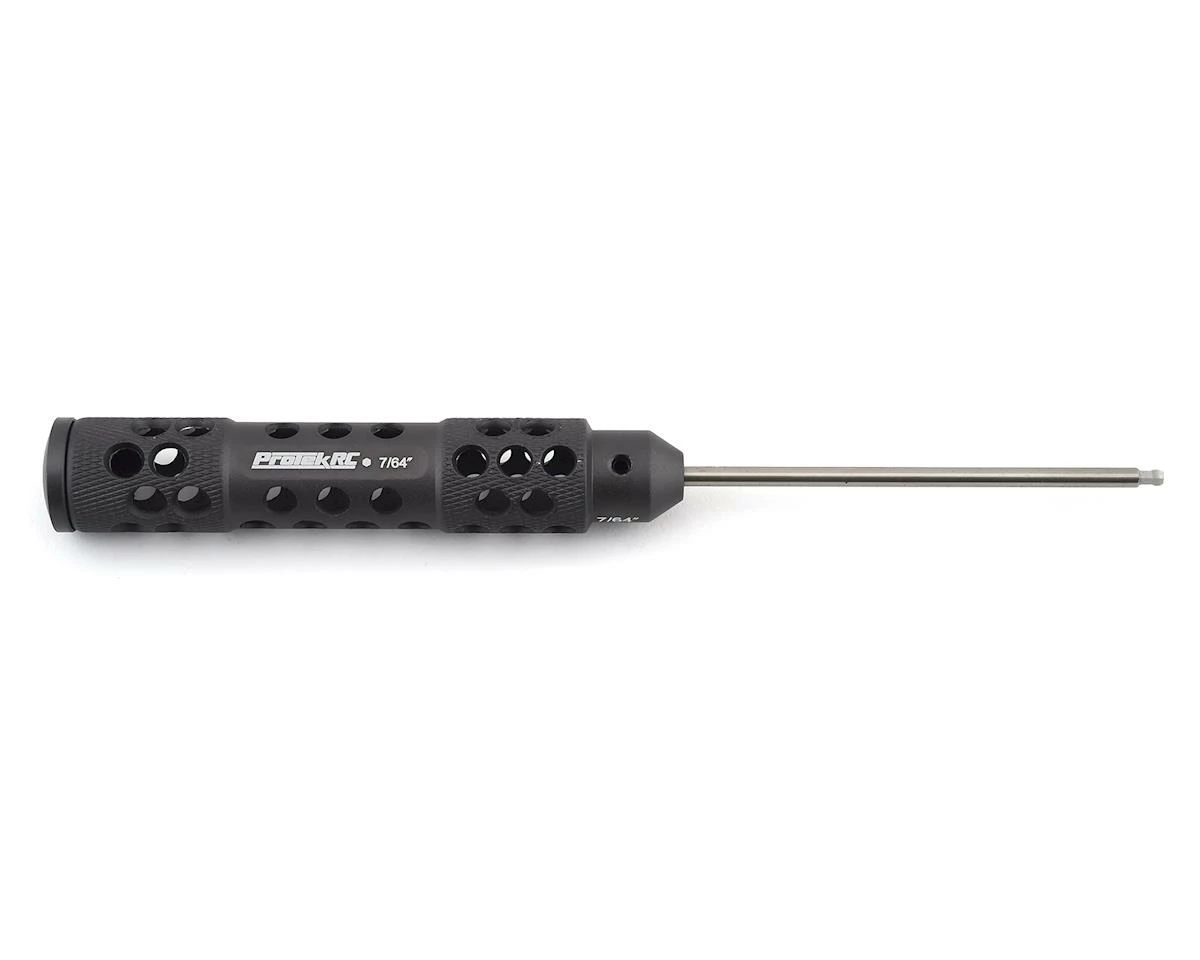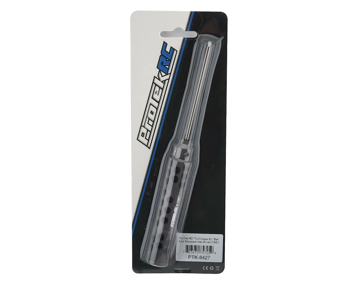 The ProTek R/C “TruTorque SL” 7/64″ Ball End Standard Hex Driver features a large 20mm diameter handle with machined relief holes and cross hatch knurling to reduce weight and provide a high grip surface. The end of the handle features a rotating end cap that allows the tool to spin in your palm, maximizing comfort during long wrench sessions. Plus, the tip size is laser etched in not one – but the THREE different spots on the handle to help simplify identification.