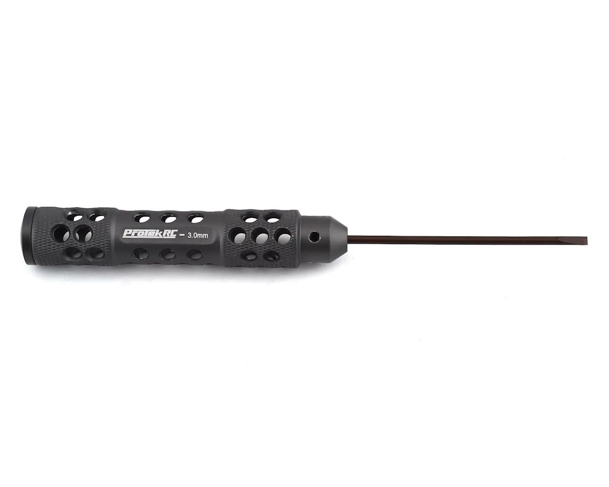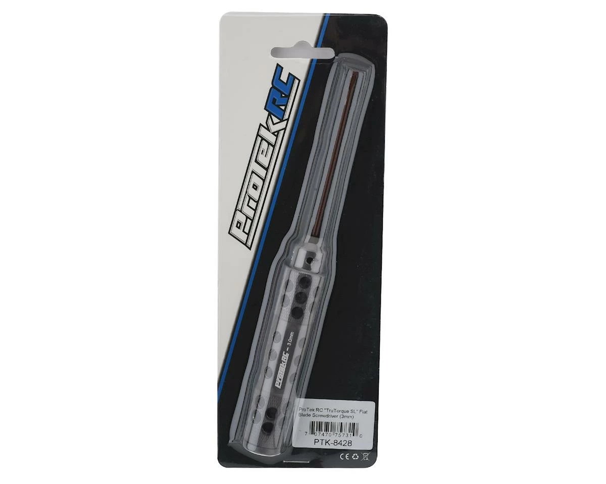 ProTek R/C “TruTorque SL” 3mm Flat Blade Screwdrivers feature a large 20mm diameter handle with machined relief holes and cross hatch knurling to reduce weight and provide a high grip surface. The end of the handle features a rotating end cap that allows the tool to spin in your palm, helping to minimize discomfort during long wrench sessions. Plus, the tip size is laser etched in not one – but the THREE different spots on the handle to help simplify identification.