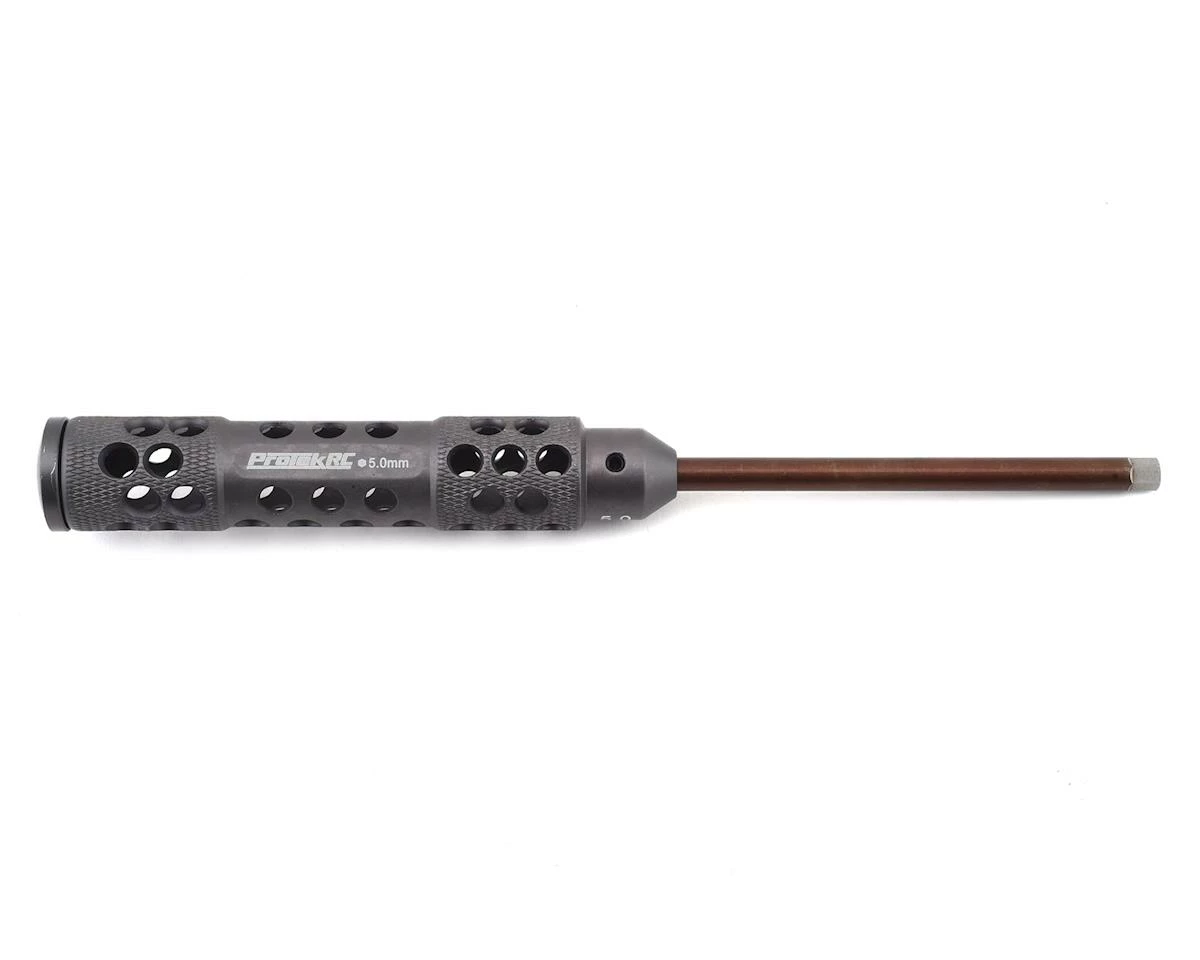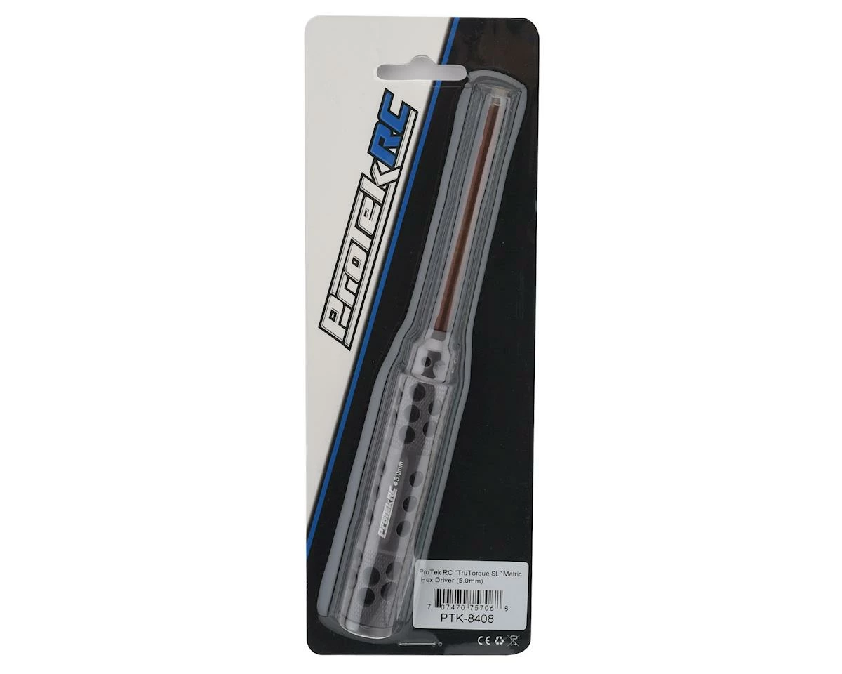 The ProTek R/C “TruTorque SL” 5mm Metric Hex Driver features a large 20mm diameter handle with machined relief holes and cross hatch knurling to reduce weight and provide a high grip surface. The end of the handle features a rotating end cap that allows the tool to spin in your palm, helping to minimize discomfort during long wrench sessions. Plus, the tip size is laser etched in not one – but the THREE different spots on the handle to help simplify identification.