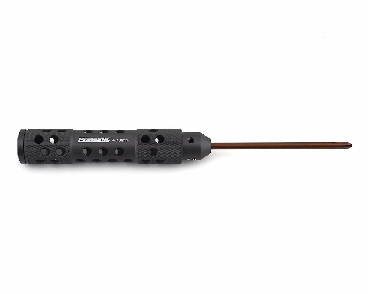 ProTek R/C “TruTorque” 4mm Phillips Head Screwdrivers feature a large 20mm diameter handle with machined relief holes and cross hatch knurling to reduce weight and provide a high grip surface. The end of the handle features a rotating end cap that allows the tool to spin in your palm, helping to minimize discomfort during long wrench sessions. Plus, the tip size is laser etched in not one – but the THREE different spots on the handle to help simplify identification.