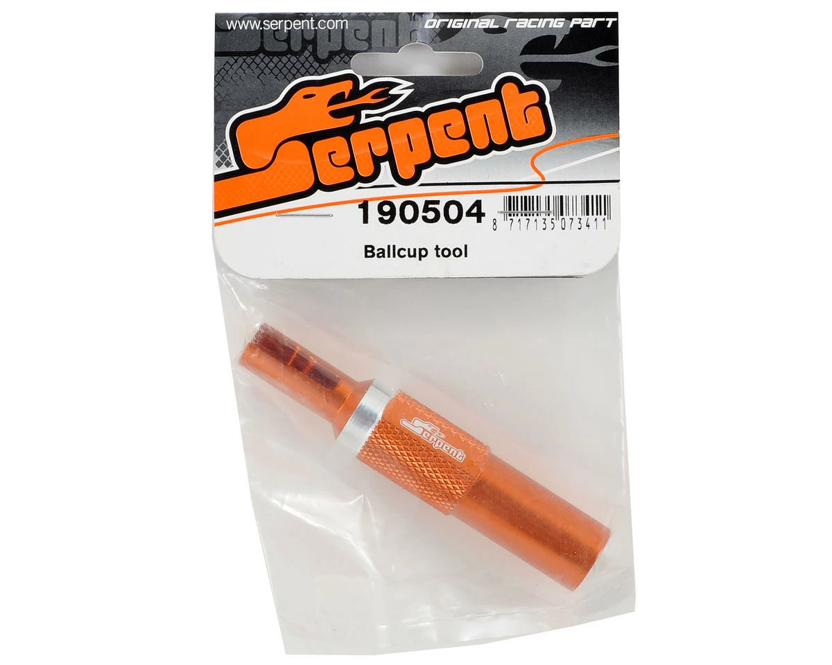 This is a Serpent Orange Aluminum Ball Cup Tool. This Handy aluminum ball cup tool is for use with the larger Cobra buggy and GT ball joints. The tool makes it easier to mount and dismount the ball joints fast and straight. The tool has also been anodized in strong orange, with an engraved Serpent logo.