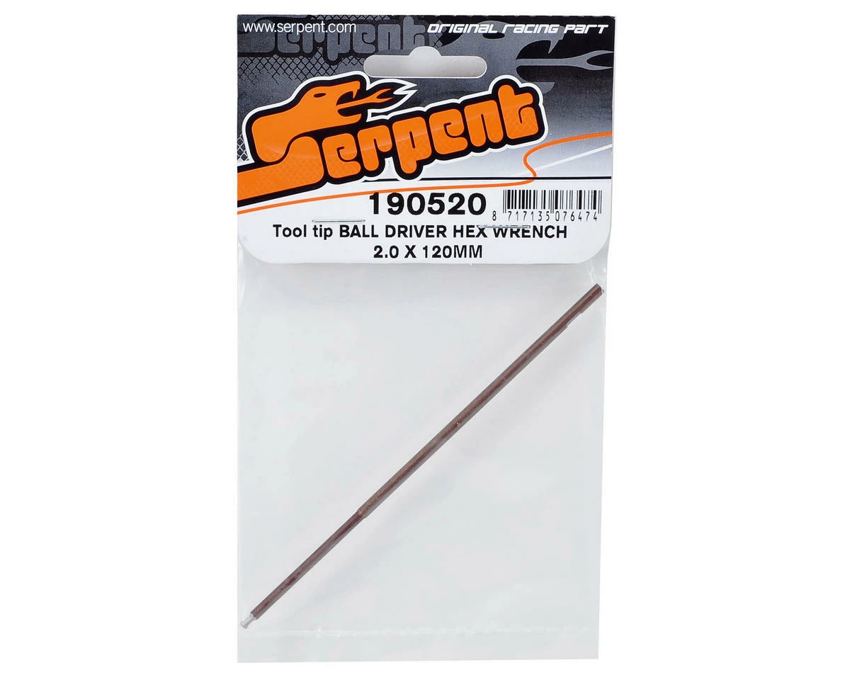 This is a Serpent 2.0x120mm Ball Driver Hex Wrench Replacement Tip. Serpent replacement tips are precision machined from hardened spring steel and are 120mm long.