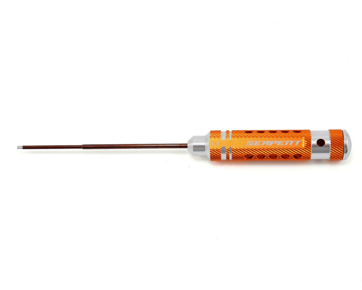 This is a Serpent 1.5x120mm Hex Wrench. Serpent tools feature a lightweight machined aluminum handle and an engraved Serpent logo, combined with precision machined 120mm long hardened spring steel tips. The shape of the handle prevents the tool from rolling off the work bench and the size of the tip is engraved in the handle for easy identification.