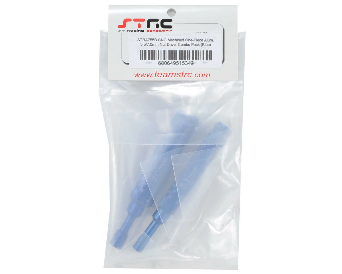STRC Aluminum 1-Piece Metric Nut Drivers are CNC Machined from a single piece of aluminum, cut to a perfect tolerance with amazing factory looks. Featuring knurled handles for good grip and ease of handling, as well as a drilled hollowed center to reduce weight. These nut drivers also feature thinned wall construction so it can more easily fit into places where space is limited. Package includes one 5.5mm driver, and one 7.0mm driver.