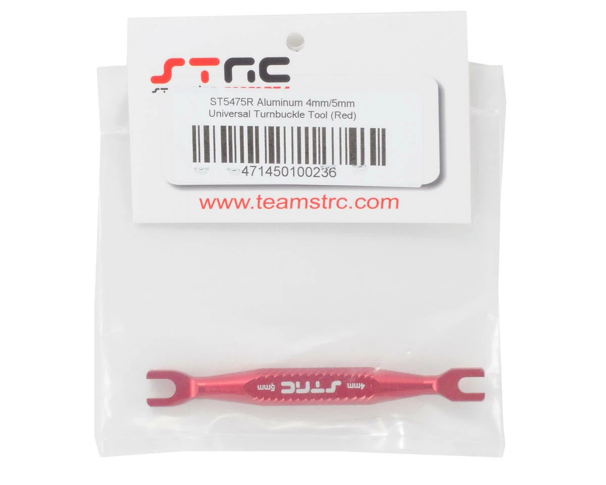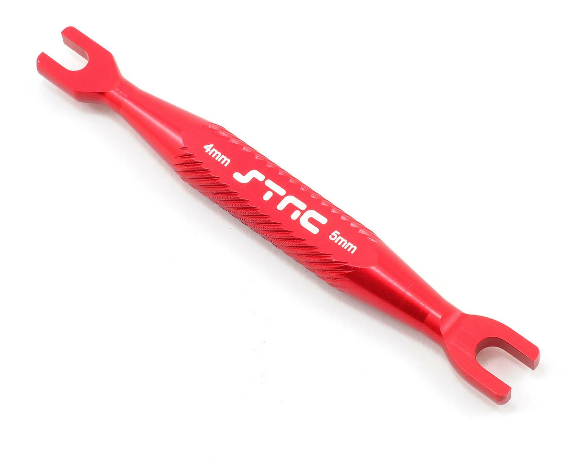 This is a ST Racing Concepts Aluminum Turnbuckle Wrench, with 4mm & 5mm ends. This light weight wrench has been CNC machined to have exact fit over 4mm turnbuckles (like ones found on Traxxas Slash, Rustler, Bandit and Stampede, or all popular on-road touring cars today) and the 5mm turnbuckle adjustment nut on the T-Maxx, E-Maxx and Revo, or any vehicle that uses a 5mm size turnbuckle. This is a great tool to use when tuning your favorite R/C racing machine.