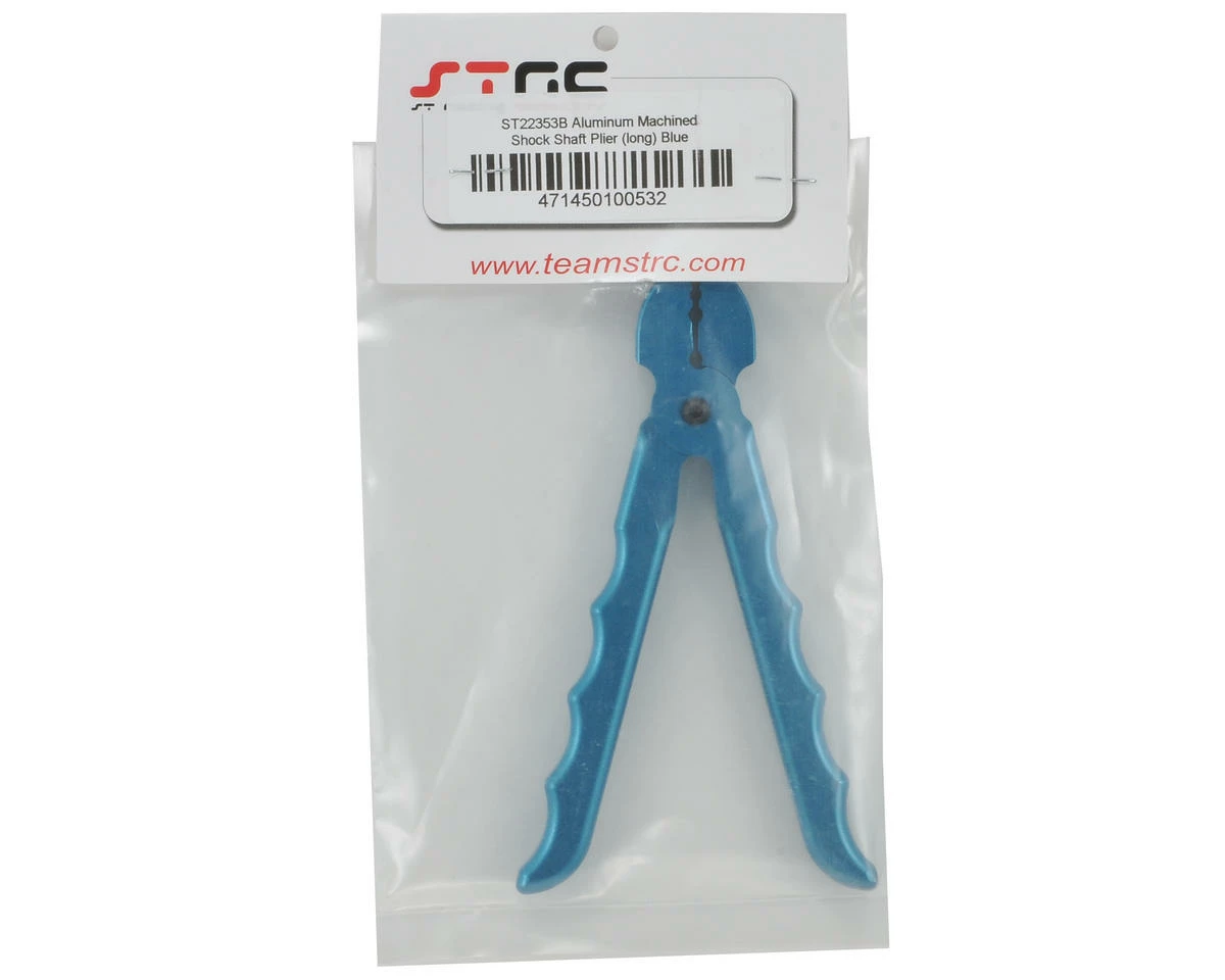 This is a set of ST Racing Concepts Shock Shaft Pliers. Threading on theshock ends without scratching the shock shaft has always been adifficult assembly task… until now! These machined aluminum shock shaftpliers allow you to firmly hold the shock shaft in place (withoutscratching the shock shaft) while you thread on the shock ends. Unlikeother shock shaft pliers currently on the market, the ST Racing shockshaft pliers feature a longer grip handle with curves machined to suityour fingers which allows your entire hand to grip over the handle toprovide a firm grip on the shock shafts. Works on various shock shaftsizes from on-road cars to 1/8th scale off-road buggies and truggies, as well as monster trucks.