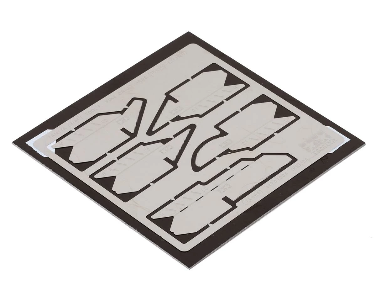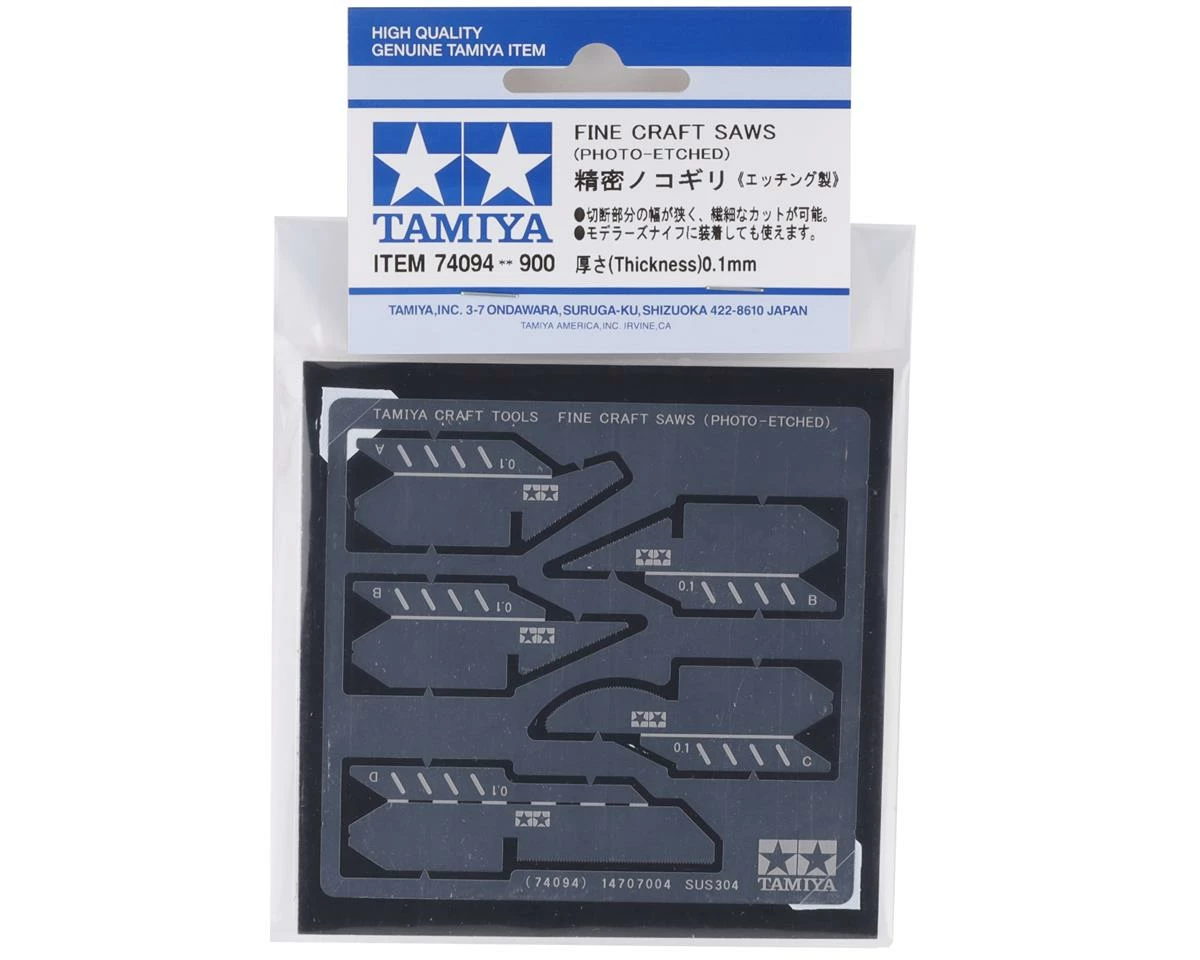 The Tamiya Photo-Etched Craft Saw Set is a photo-etched metal saw set that allows extremely fine cuts reqquired when making modifications to your models. When you use a standard craft saw for modification, you have to consider the thickness of the blade itself. However, as the blade has a 0.1mm thickness, the cut line is also very small. The set contains four straight and one curved saws and they can be used for cutting parts as well as applying panel lining. The blades feature grips which can be folded over to increase support and this feature also allows them to be fitted onto the handle of the separately available Handy Craft Saw II (TAM74111) for greater ease of use.