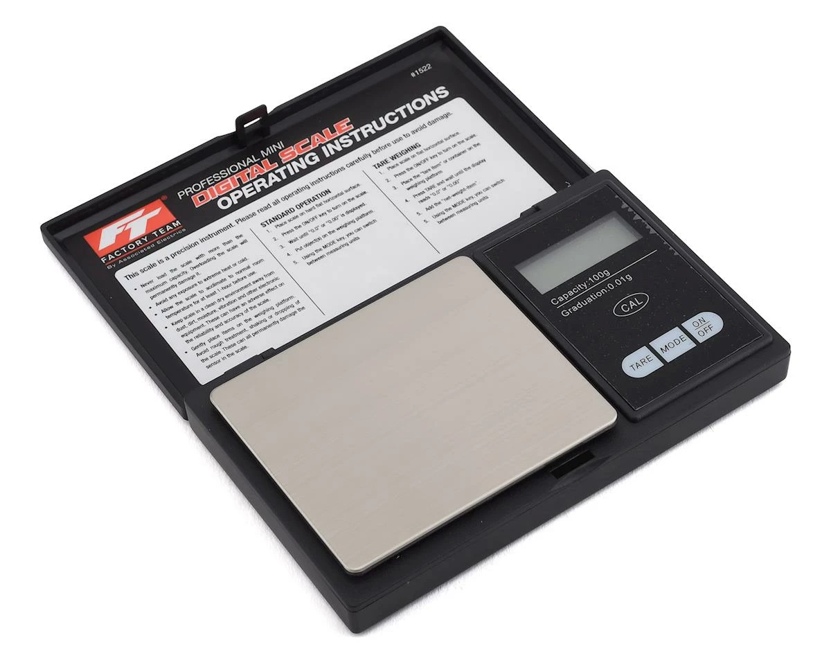 The Factory Team Professional Mini Digital Scale is the perfect tool when it comes to weighing small parts for your RC vehicle. The scale is also perfect for filling diffs with the right amount of fluid and is accurate down to 0.01 grams.