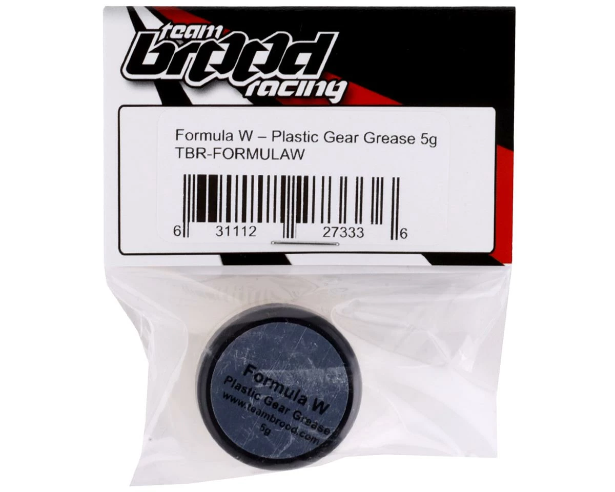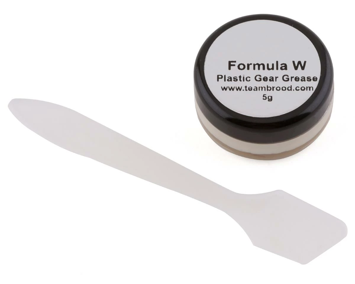 The Team Brood Formula W Plastic Gear Grease is a specifically designed white lithium grease that is loaded with anti-wear and anti-friction additives. These additives will keep plastic gears rotating longer and smoother. The Formula W grease provides superior lubrication and durability in any weather without harming the integrity of the plastic gears. Package includes one five-gram tub of grease and one applicator.