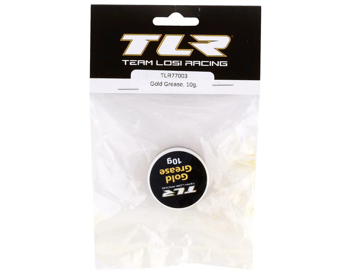 Team Losi Racing Gold Grease. Gold grease is typically used in high friction areas as an anti-wear compound, great for CVD or universal joints. Package includes one ten-gram tub of gold grease.