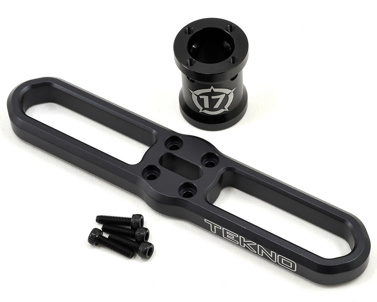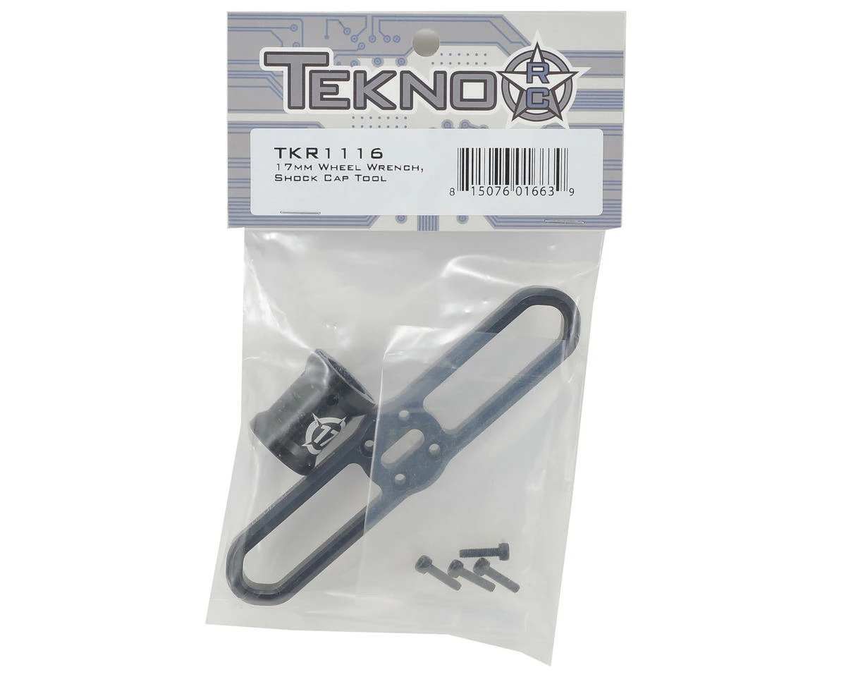 This is the Tekno RC 17mm Wheel Wrench & Shock Cap Tool. The Tekno wheel wrench features a unique handle design that is comfortable in the hand and provides more leverage versus traditional designs. This is accomplished by a longer handle that has ergonomic chamfering throughout for comfort. The wrench also doubles as a shock tool to help aid in the removal and installation of Tekno RC shock caps. Just flip the wrench over and the oval slot on the top fits perfectly over the shock mounting boss on Tekno caps. Additionally, laser etched markings and a two tone anodized finish help make the tool look good and easy to spot among the many other wheel wrenches on the market.
