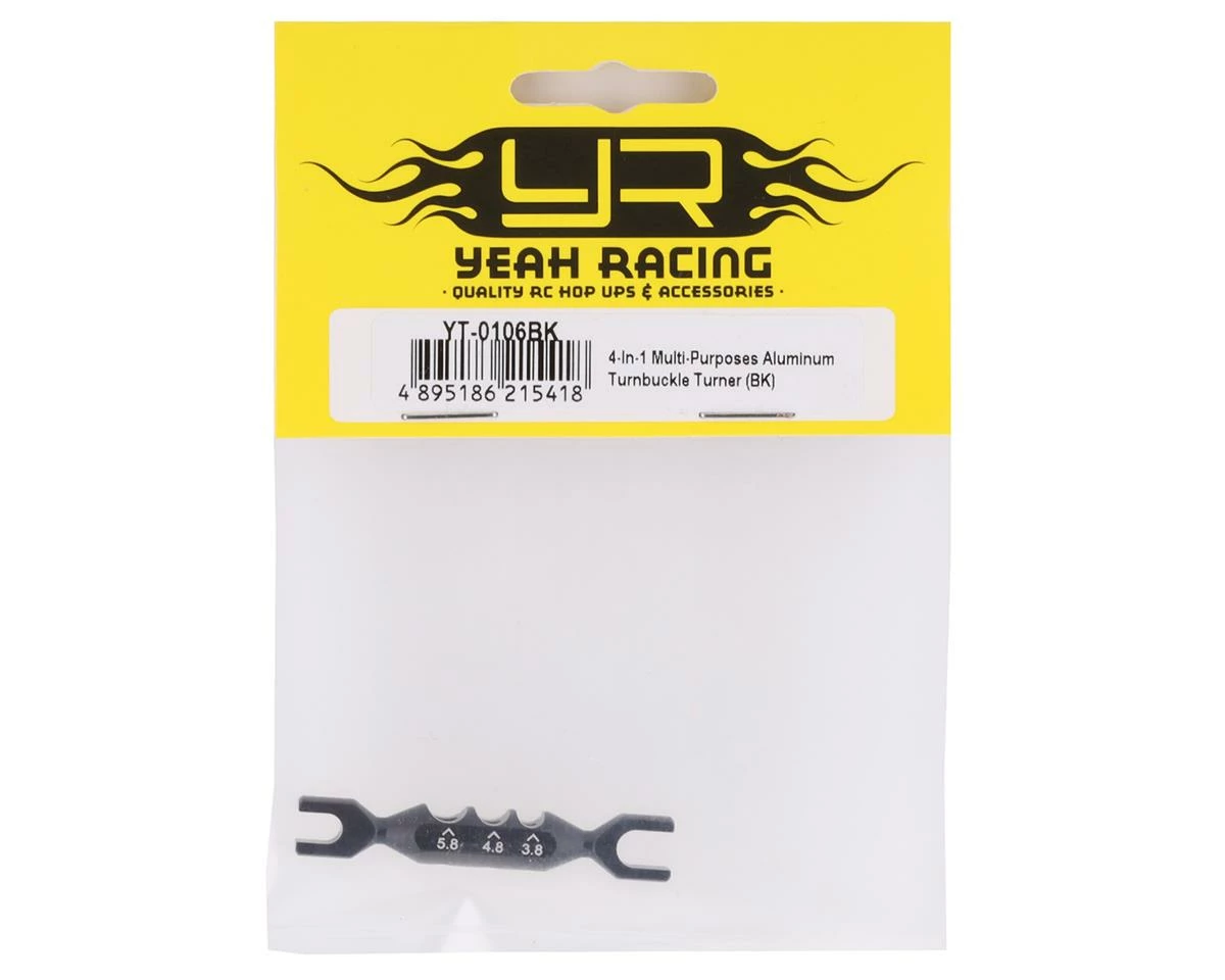 Yeah Racing Aluminum 4-in-1 Multi-Purposes Turnbuckle Wrench. This turn buckle wrench is great for measuring ball ends, screws and adjusting turnbuckles. Package includes one turnbuckle wrench.
