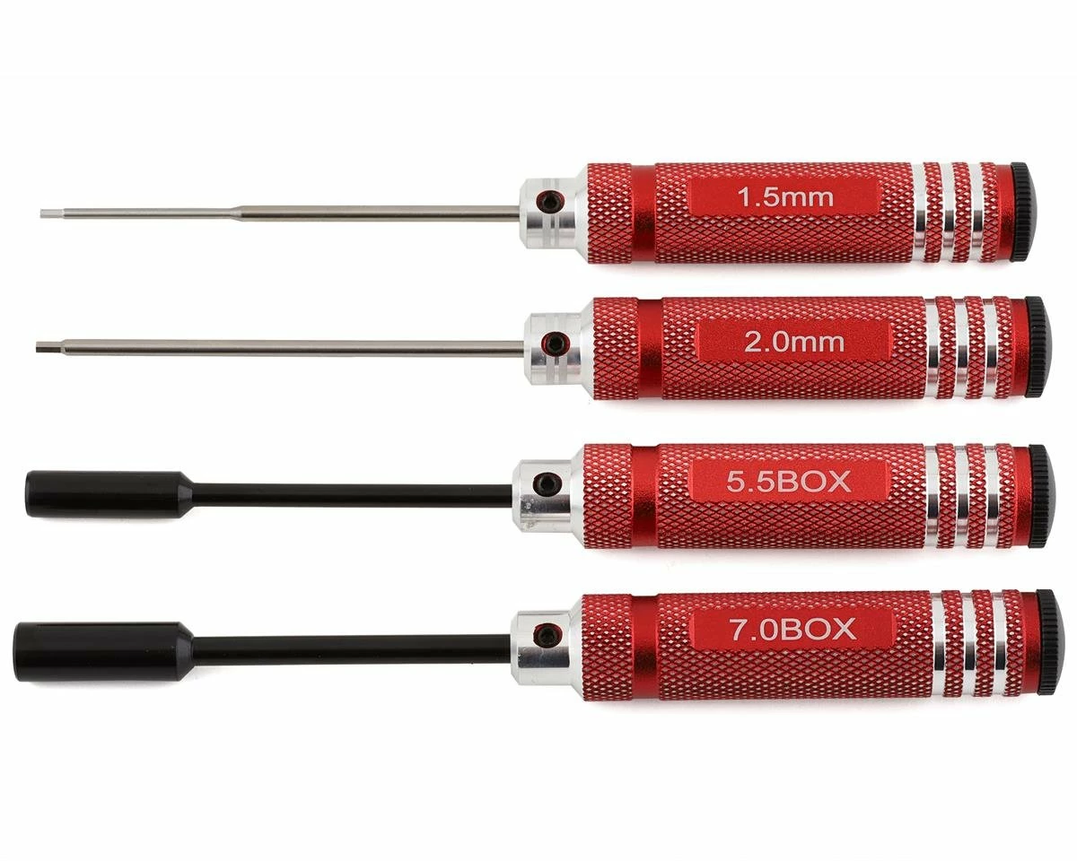 Yokomo Metric Hex and Nut Driver Set. This tool set is a great option to add an ergonomic tool set to your pit station or tool bag. The red anodized aluminum handles are marked for easy identification. These sizes are perfect for wrenching on most 1/12, 1/10 and 1/8 scale RC models. Complete your toolkit in style with this hex and nut driver set from Yokomo.